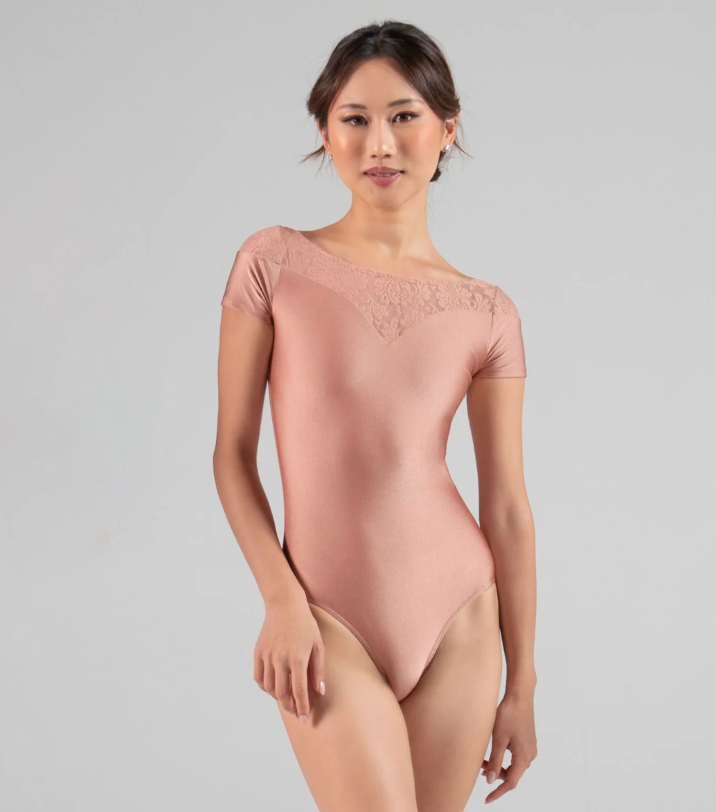 Cap sleeves and floral stretch lace inserts enhance the silhouette with gentle texture, creating a timeless design suited for both class and stage.